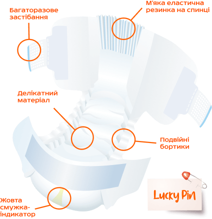 Свобода в рухах, міцний сон і ефективний захист від протікань — Lucky Pin робить життя мами й дитини максимально комфортним! Ультратонкі м’які підгузки забезпечують тривалу сухість, свободу рухів під час сну та активних ігор, м’яко прилягають і не натирають. Підгузки мають м’які подвійні бортики, індикатор наповнення, еластичну резинку на спинці та багаторазові застібки-липучки, які надійно фіксують підгузник Асортимент розмірів дає змогу вибрати оптимальний варіант із урахуванням ваги малюка.